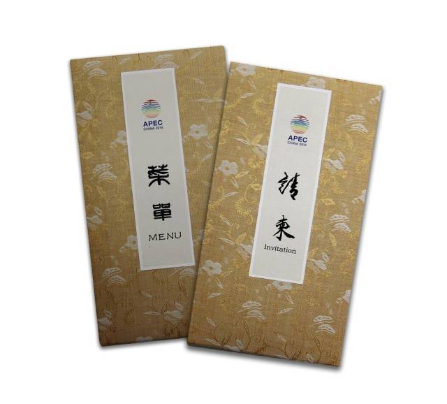 APEC会议的请柬、菜单是由界龙集团下属子公司上海界龙艺术印刷有限公司承印。APEC 20个成员经济体的领导人,都会收到东道主中国发来的一张请柬,所以每一张请柬和菜单都经过精心设计和制作。米黄缎面、云锦图案的请柬,正面以行楷体书写的“请柬”二字,出自年逾9旬的上海书画大师陈佩秋之手。打开请柬,内页纸张由5层宣纸反复裱制而成,已过世的谢稚柳大师绘画的生机盎然的国画山水扑面而来。为防止意外,每一本请柬都需要备份多份,艺术公司反复推敲每一个环节的制作,不断修改。菜单所用工艺和材料与请柬一样,册页封面均采用华丽锦缎面手工装帧,工艺精湛,品质卓越。