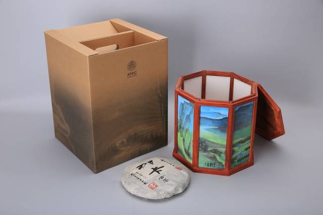 APEC会议的礼品宫灯和普洱茶的包装盒是由界龙集团下属子公司上海外贸界龙彩印有限公司承印。接到任务后,集团设计中心与外贸界龙工艺科根据礼品特点,决定延续文化视觉美感,继续采用中国画元素,并运用绿色环保的柔版印刷工艺,迎合视觉水印、水墨印刷的潮流,同时加大网点,增加水墨画的雾气和水墨单色色调的意境。此外,通过精心设计的内衬和卡扣,礼品包装的结构保护也做得十分细致,加上采用界龙多年经验积累的微型瓦楞包装材料,使礼品包装集视觉工艺、印刷工艺、包装结构工艺于一体,很好地展现了中国文化元素,也体现了界龙印刷的先进技艺。