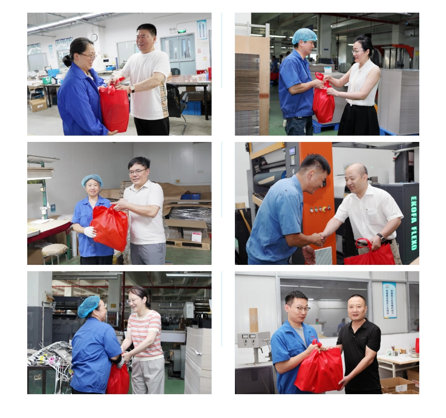 8月7日、8日,界龙集团董事会主席费钧德、总裁费屹立、党委书记兼副总裁费屹豪等集团主要领导带领集团工会、人事、安全等方面的负责人前往各子公司生产车间,走访慰问奋战在生产一线的广大员工,向辛勤工作的劳动者致以亲切的问候,并送去了防暑降温慰问品。