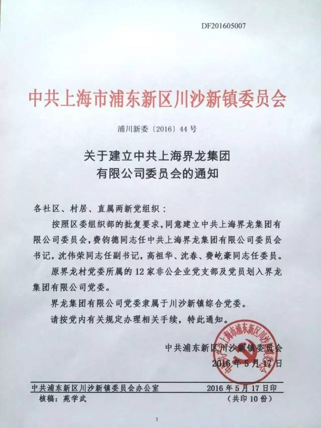 经浦东新区区委组织部和川沙新镇党委批准,新成立的界龙集团党委班子由5位同志组成:费钧德同志任党委书记,沈伟荣同志任副书记,高祖华、沈春、费屹豪同志任委员。界龙集团党委下属现有12家企业党支部,137名在册党员。