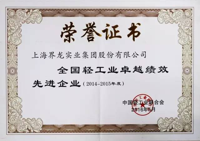 近日,由中国轻工业联合会主办的“2014—2015年度全国轻工业卓越绩效先进企业颁奖”活动在京举行,对在轻工业卓越绩效规模发展中起到领先作用的企业及具有品牌竞争力优势的产品进行表彰。上海界龙实业集团股份有限公司再度荣获“全国轻工业卓越绩效先进企业”。