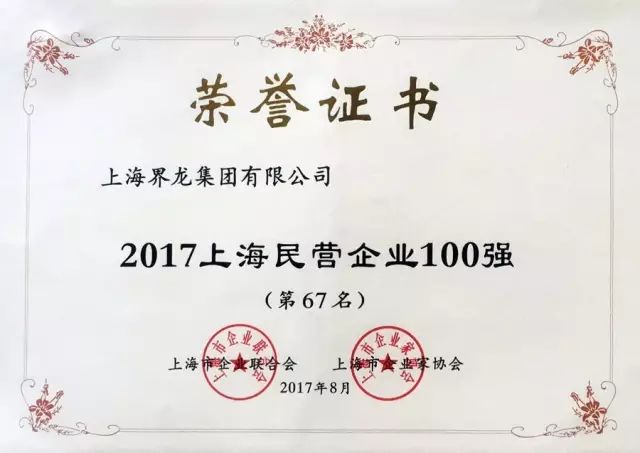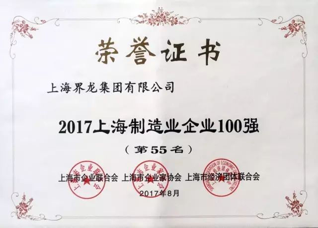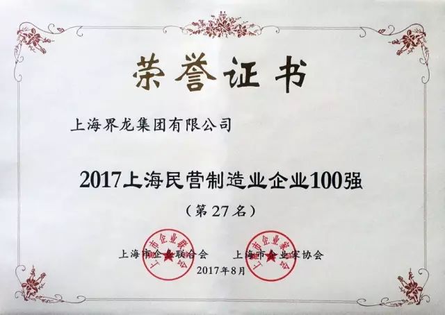 此次上海界龙集团有限公司获评“2017上海制造业企业100强(第55名)”、“2017上海民营企业100强(第67名)”、“2017上海民营制造业企业50强(第27名)”。