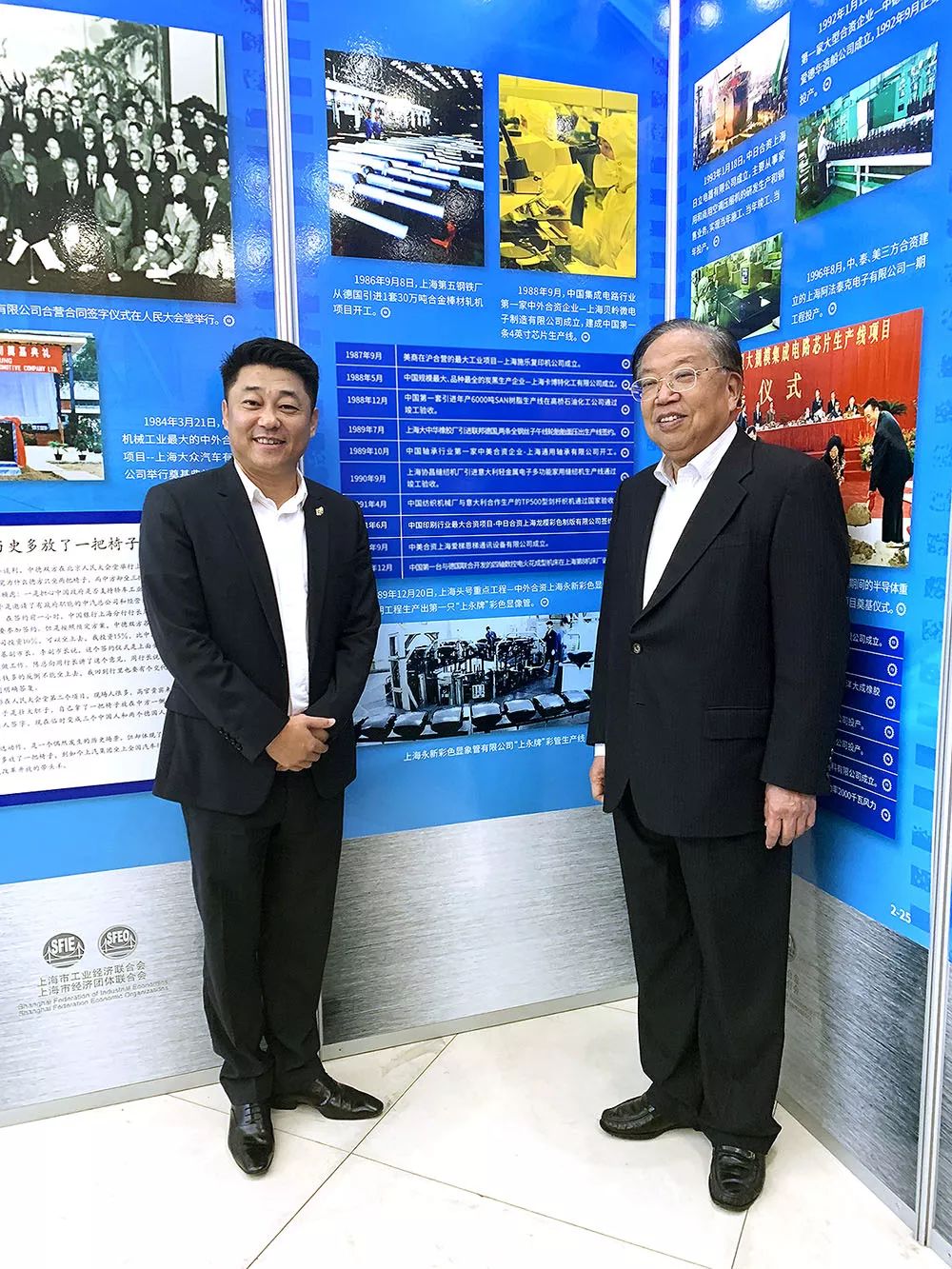 费屹立董事长与中国工业经济联合会主席团主席、原上海市政协主席蒋以任在图片展前亲切合影
