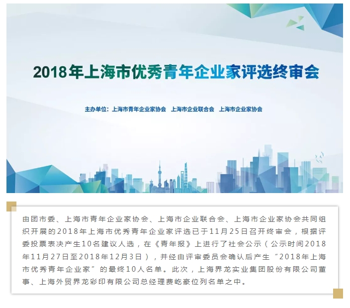 最终费屹豪入选“2018上海市优秀青年企业家”前10名。