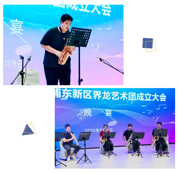 成立大会现场,艺术团下属的界龙萨克斯重奏乐团老、中、青团员分别带来精彩纷呈的萨克斯重奏汇报演出,部分艺术团成员也表演了二胡演奏、歌曲独唱等精彩的节目,赢得了台下阵阵掌声,充分展现了界龙艺术团深厚的文艺基础和积极向上的精神风貌。
