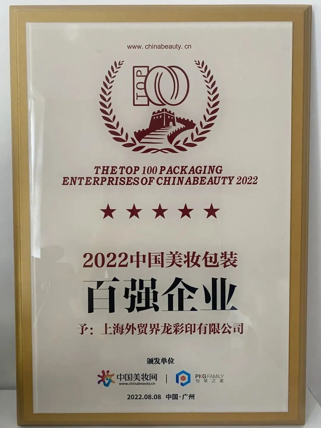 本次,上海外贸界龙彩印有限公司荣获2022中国美妆包装企业百强。此奖项是对外贸界龙在化妆品包装市场所做出成绩的肯定,也是对外贸界龙的支持和信任,未来将继续载誉前行,延续荣光!