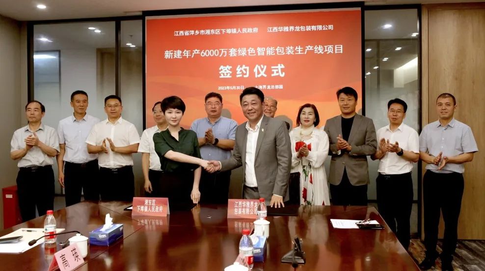 5月30日下午,在江西省委宣传部分管日常工作的副部长傅云的见证下,江西省萍乡市湘东区下埠镇人民政府与江西华雅界龙包装有限公司“新建年产6000万套绿色智能包装生产线项目”在上海界龙总部园举行签约仪式。