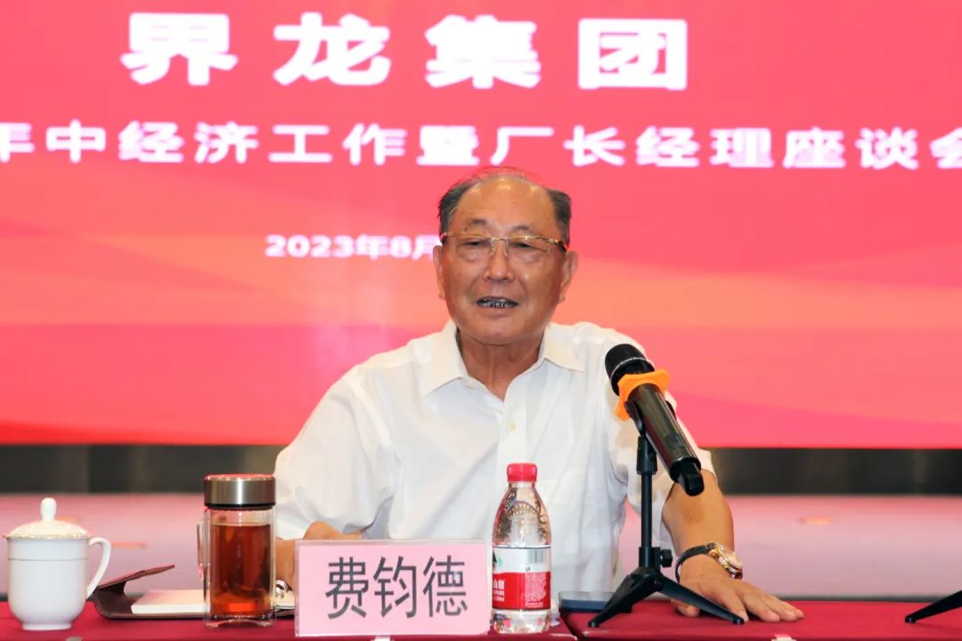 界龙集团董事会主席费钧德作总结讲话,他肯定了大家前一阶段做出的辛勤工作和取得的成绩。费主席提出,界龙创业50多年实属不易,大家要认真学习老一辈的优良作风,要有干事的决心,热爱自己的岗位、热爱自己的企业,继续发扬创业精神。要大胆引进人才,同时做好接班人的培养工作。抓住机遇,勇于挑战,让我们的企业永葆青春。