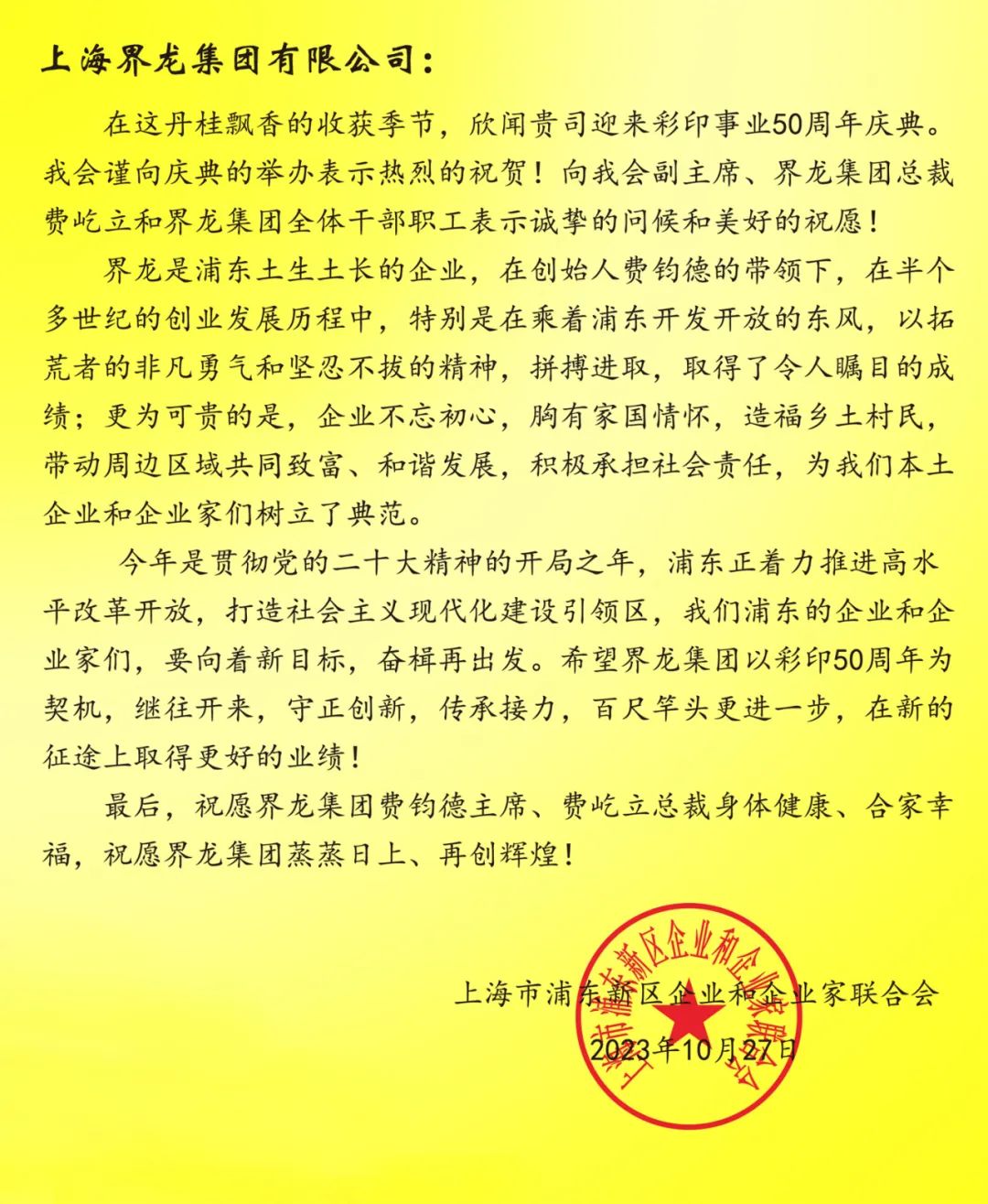 欣闻界龙彩印50周年庆典,上海市侨联党组书记、主席齐全胜发来贺信。他在贺信中说:界龙过去50年的发展,是侨界的骄傲。祝愿界龙集团在新时代新征程上,进一步发扬企业家精神,坚定信心,勇于创新,不断推动企业高质量发展,更好履行企业社会责任,为强国建设、民族复兴做出新的更大的贡献!